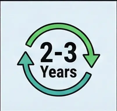 일반적으로 2-3년이에요. 500-800회 충전 사이클 후 원래 용량의 80% 수준으로 떨어집니다. 관리를 잘하면 3년 이상도 가능해요.