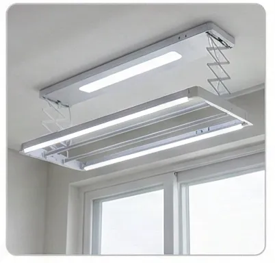 전동(자동) 천장형은 리모컨 버튼 하나로 봉이 내려왔다 올라가는 방식이에요. 노약자나 키 작은 분들이 있는 가정에서 특히 인기가 높습니다.