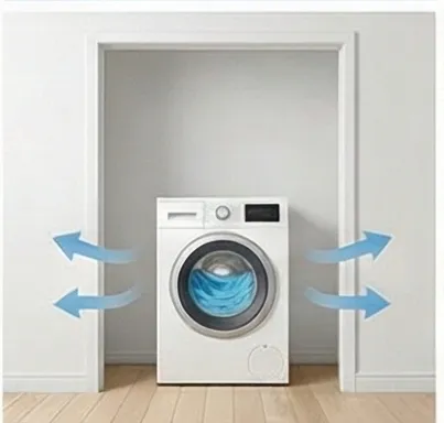 다음은 통풍과 환기입니다. 건조기는 열을 사용하는 제품이라 주변 공기 순환이 중요해요. 벽과의 거리는 뒤쪽으로 최소 10cm 이상, 이상적으로는 30cm 이상 확보해야 합니다.