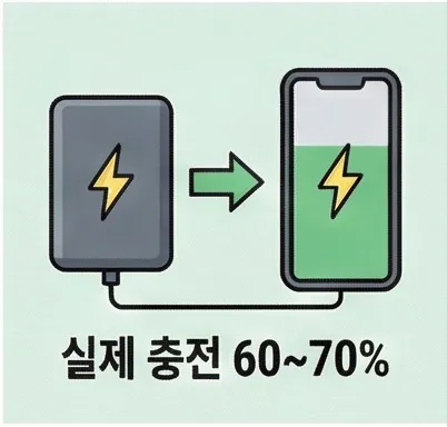 예시: 10,000mAh 보조배터리 → 실제 6,000~7,000mAh 충전 가능